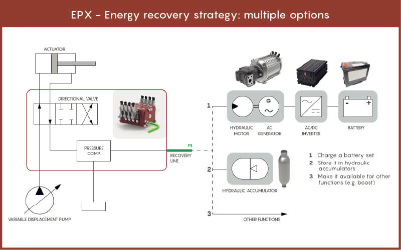 EPX, parte delle Hydraulic Digital Solutions, innova oltre gli standard del settore con un dispositivo a tre vie, che non solo limita la velocità di azionamento, ma recupera anche l'energia gravitazionale e cinetica immagazzinata.